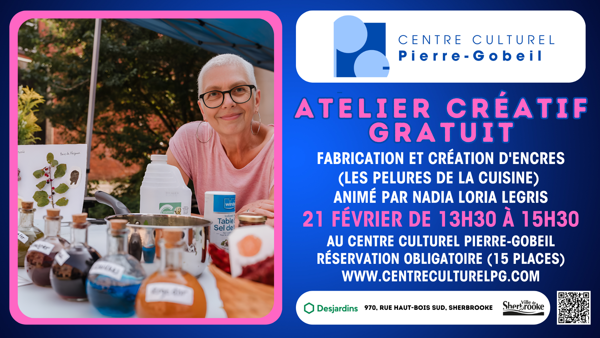 Des ateliers artistiques gratuits L’équipe du Centre culturel Pierre-Gobeil vous offre 7 ateliers créatifs gratuits! Réservez-vos places à l’avance car plusieurs ateliers accueillent un maximum de 15 personnes. 21 FÉVRIER 28 MARS 18 AVRIL 9 MAI